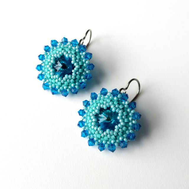 This pair features a beautiful Bermuda blue 12 mm rivoli (the centre) encased in aqua-turquoise seed beads. The earrings have been finished with a picot border of 3 mm crystal bicones in Capri blue. With flashes of blues, greens and turquoises, these earrings are perfect for summer days!