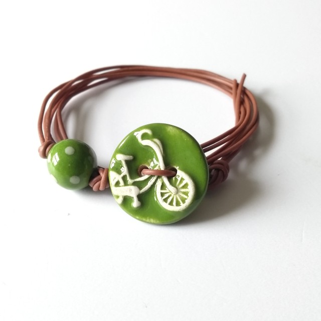 An easy-to-wear vegan-friendly wrap bracelet in chestnut brown, featuring a ceramic bicycle button and matching polka dot bead in leaf green by UK artisan, Bo Hulley Beads. Simply wrap around the wrist three times and pass the button through the loop - you're good to go!