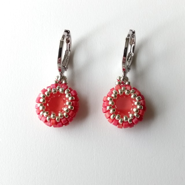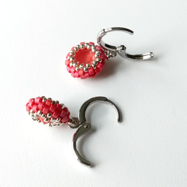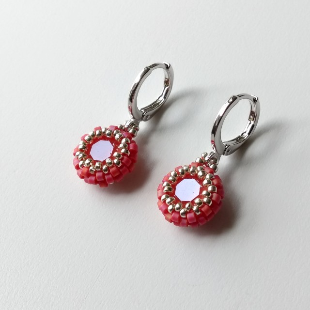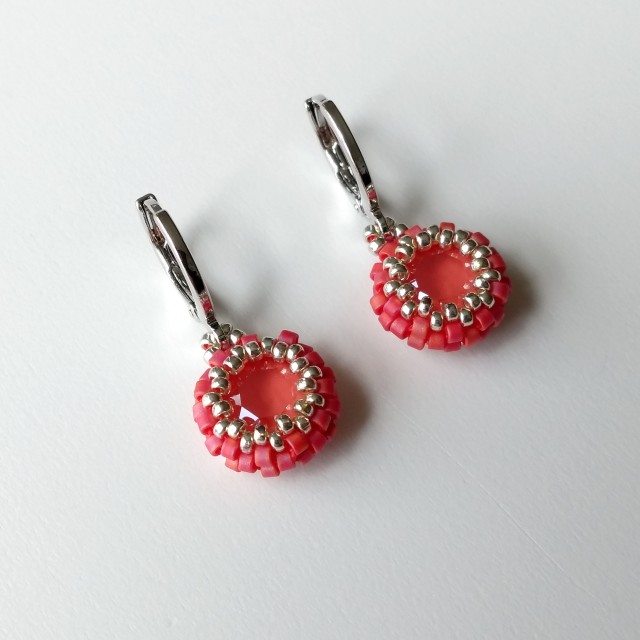 This dainty pair features a beautiful Austrian-made 8mm chaton (the centre) in light coral - a lovely raspberry/coral pink - encased in matte raspberry red and silver seed beads. The drops have been strung directly on to platinum-plated lever back round earrings, making them nice and secure. The lever backs are hinged for easy-open, easy-close - see photo. Also available in azure blue; see separate listing.