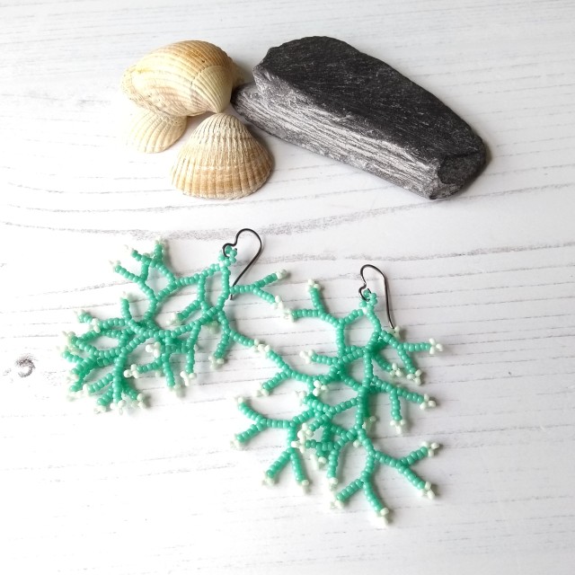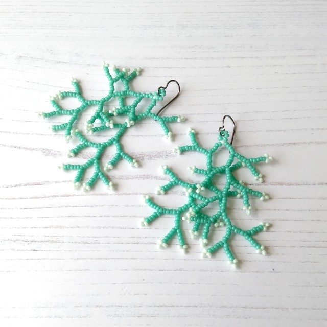 Lightweight and eye-catching, I have used glass seed beads in a pastel mint green, plus accent beads in a light green. Each earring consists of two "fronds", so the earrings have a nice bit of movement to them.