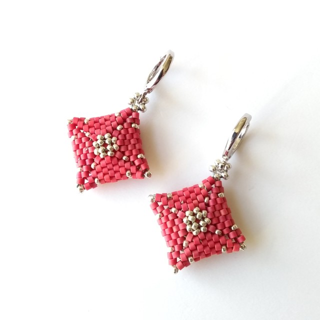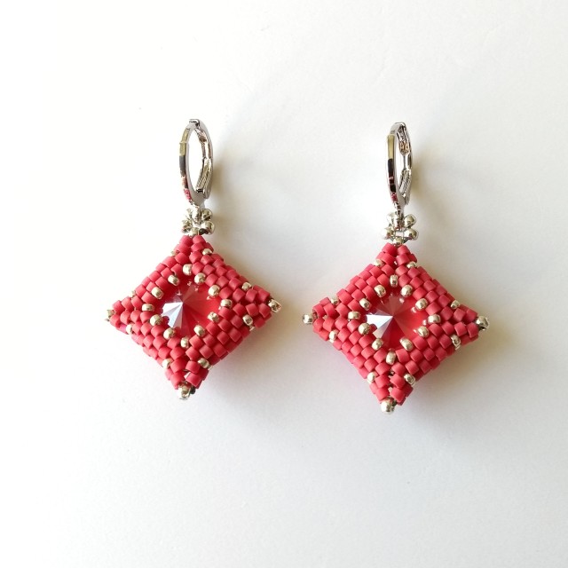 This pair features a beautiful Austrian-made 12mm rivoli (the centre) in royal red - a lovely pinkish-red - encased in matte raspberry red and silver seed beads. The drops have been strung directly on to platinum-plated lever back round earrings, making them nice and secure. The lever backs are hinged for easy-open, easy-close (see example shown in another style). I've also included a photo of the reverse because that should look pretty too!